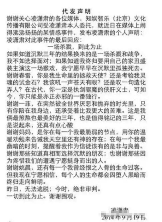 2011年1月,姚晨与凌潇肃同步更新微博,用简洁克制的文字宣布和平分手。措辞理性,未涉是非,一度被媒体称为“教科书式离婚声明”。